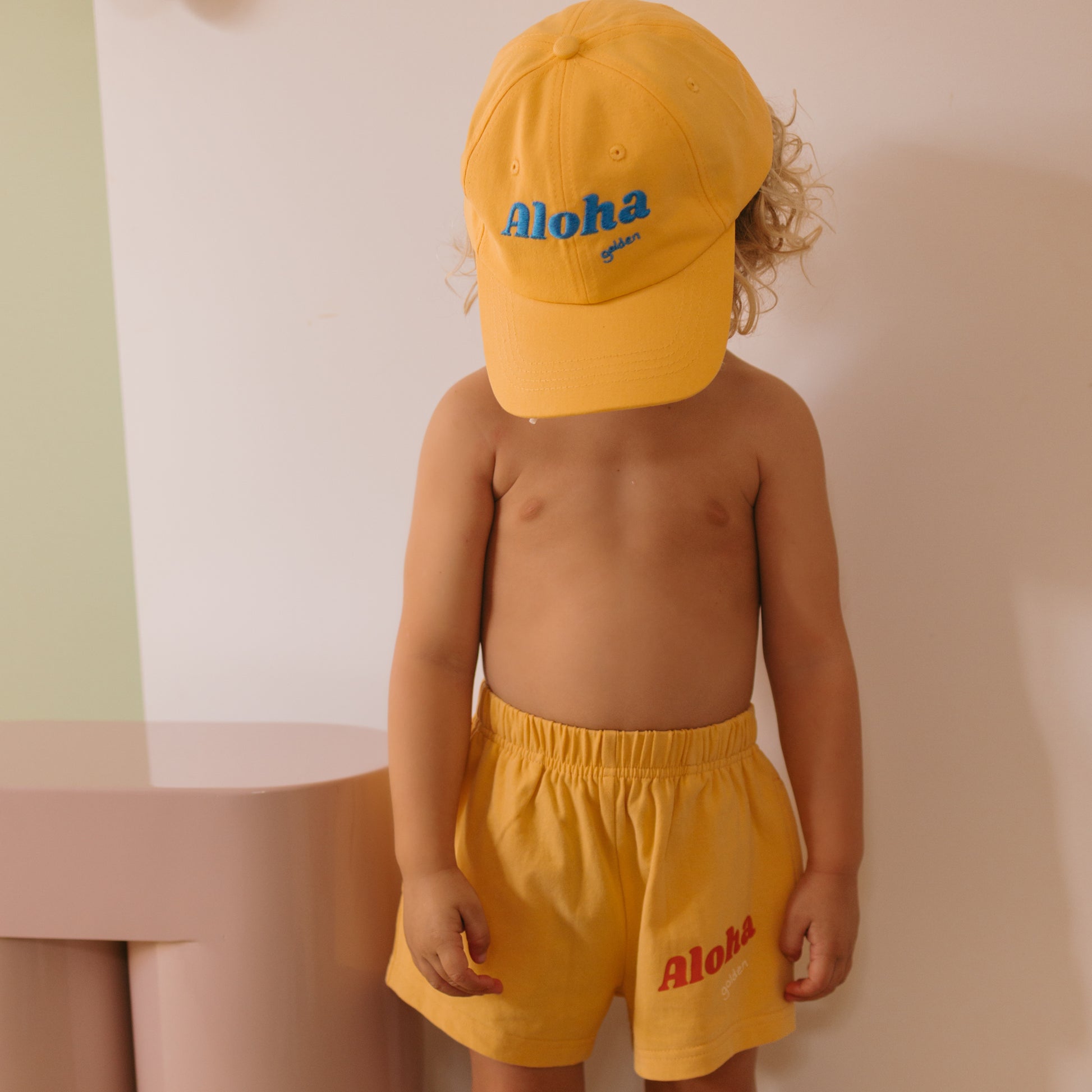 The cap features the word ‘Aloha’ embroidered to the front with the Golden logo embroidered to the back. It is adjustable with a brass clasp to the back.
