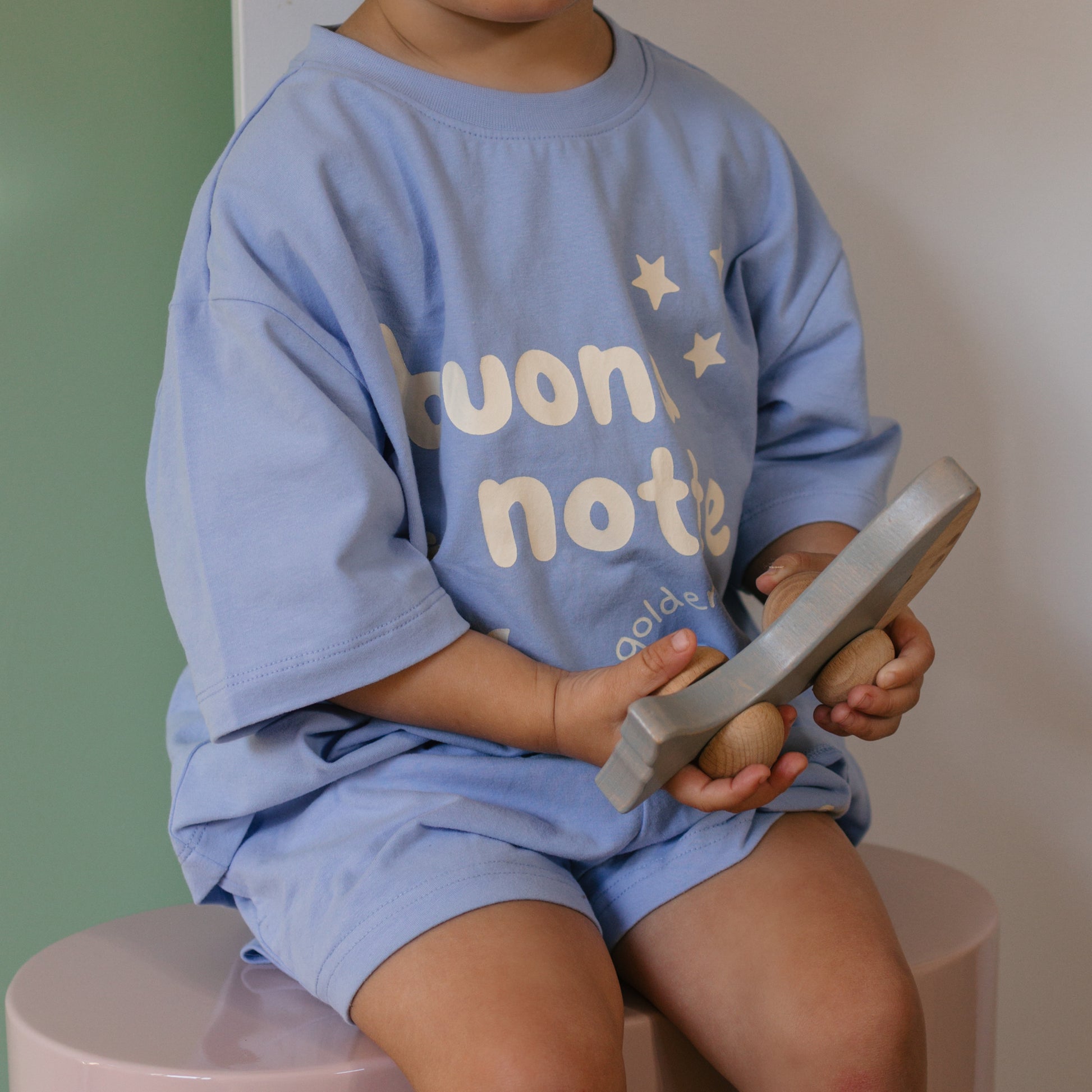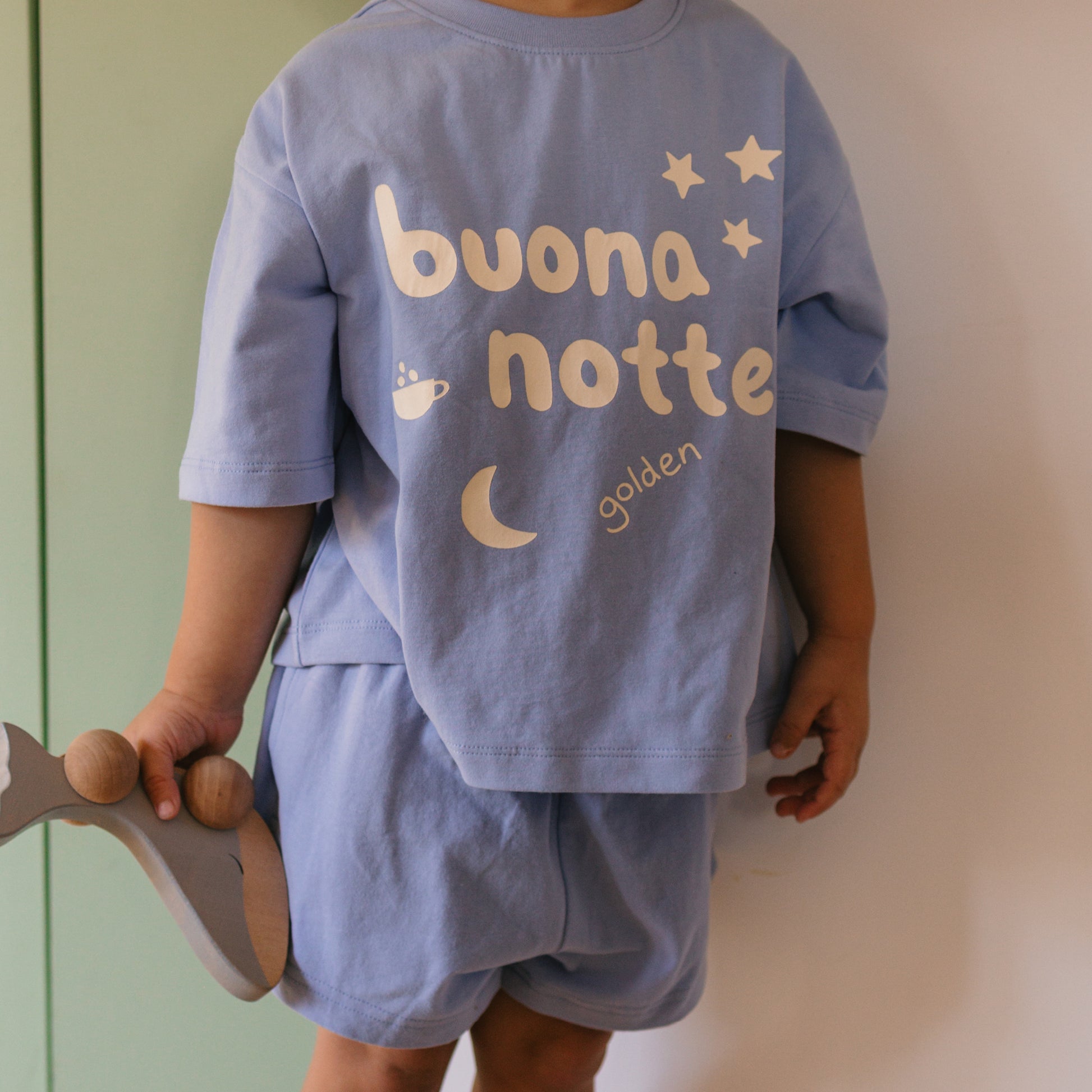 The Buona Notte Summer Pyjamas are made from 95% cotton jersey, 5% spandex with an incredibly soft hand feel. The print is inspired by our love of all things sleep related, from warm milk and snuggles at night to bagels, fresh orange juice and (often cold) coffee in the morning.