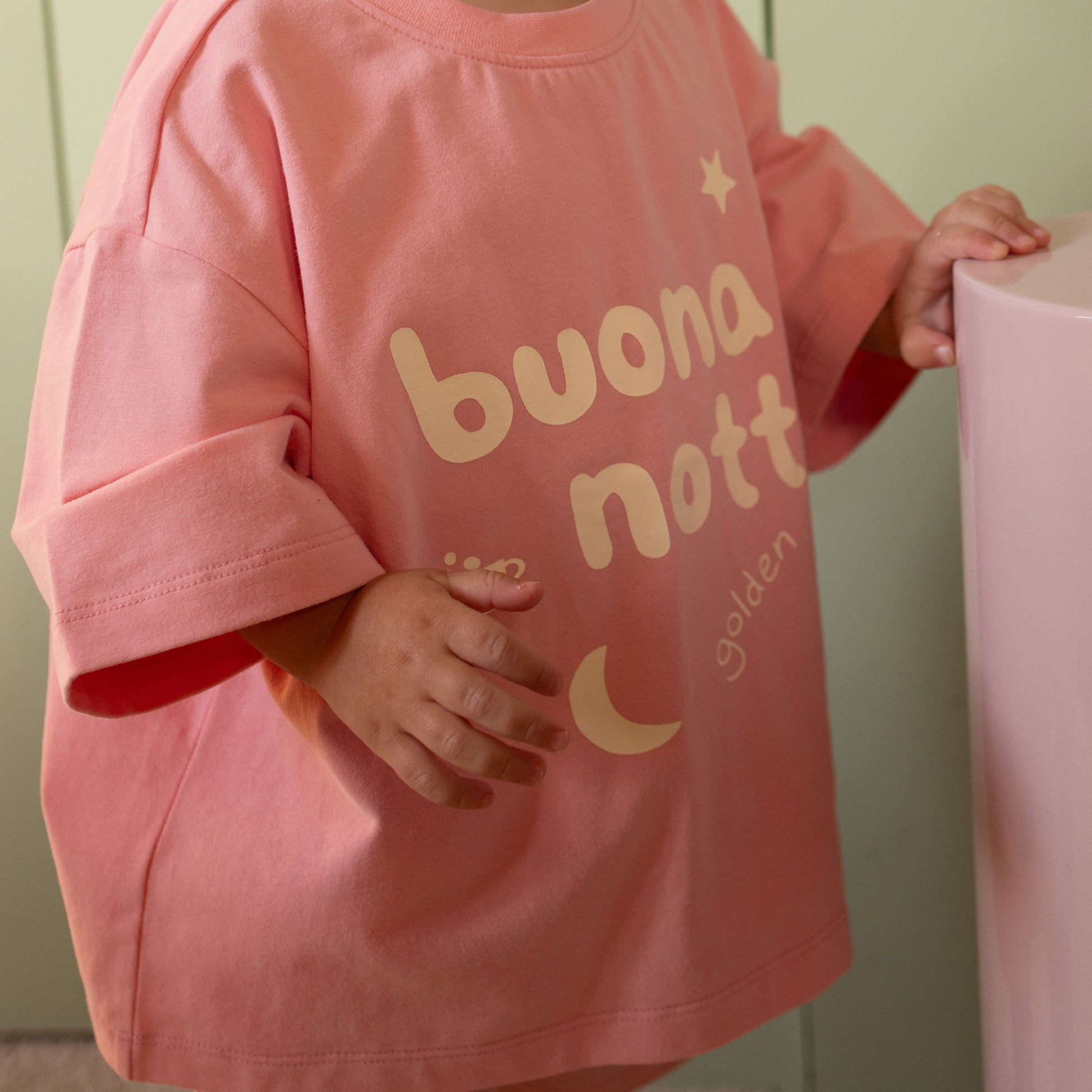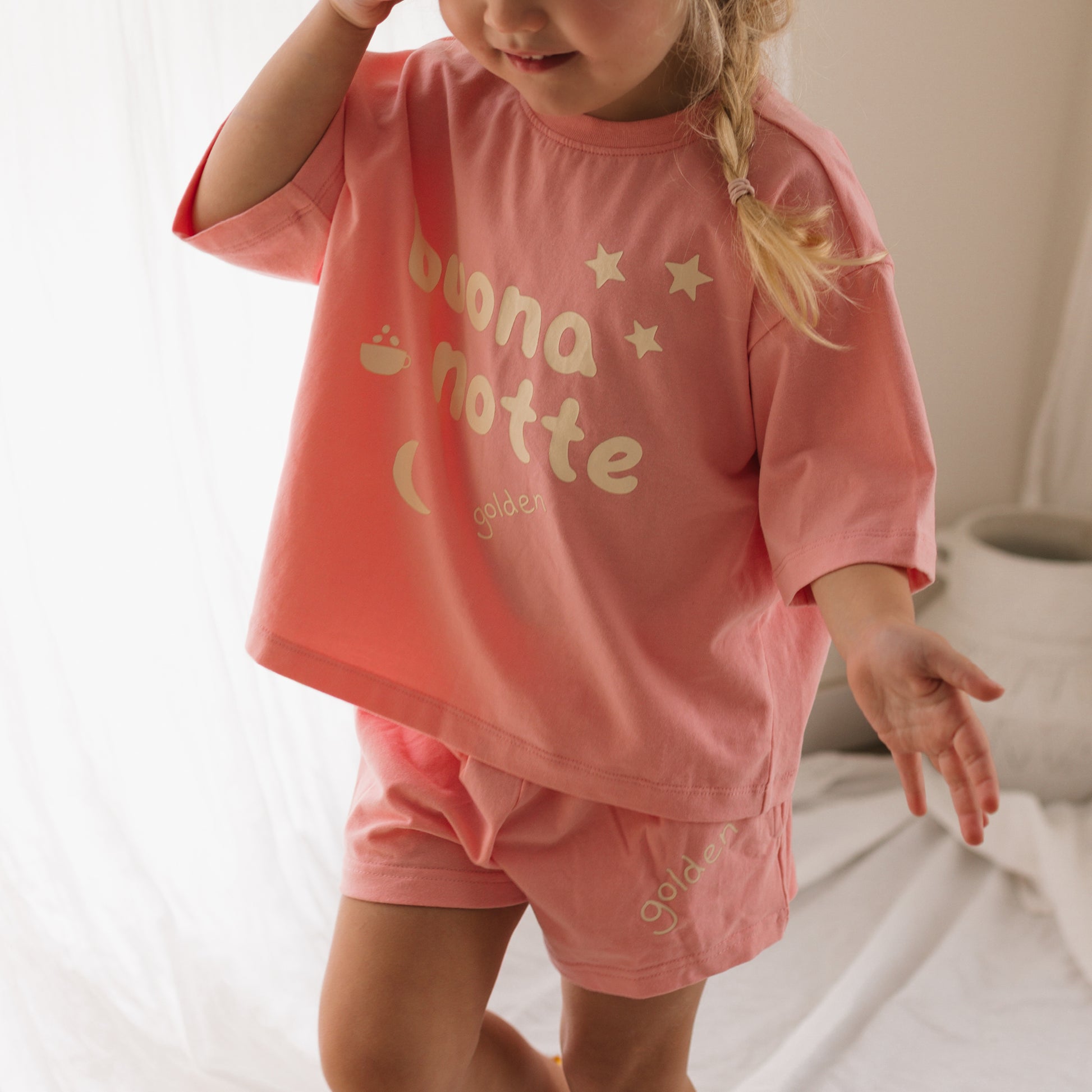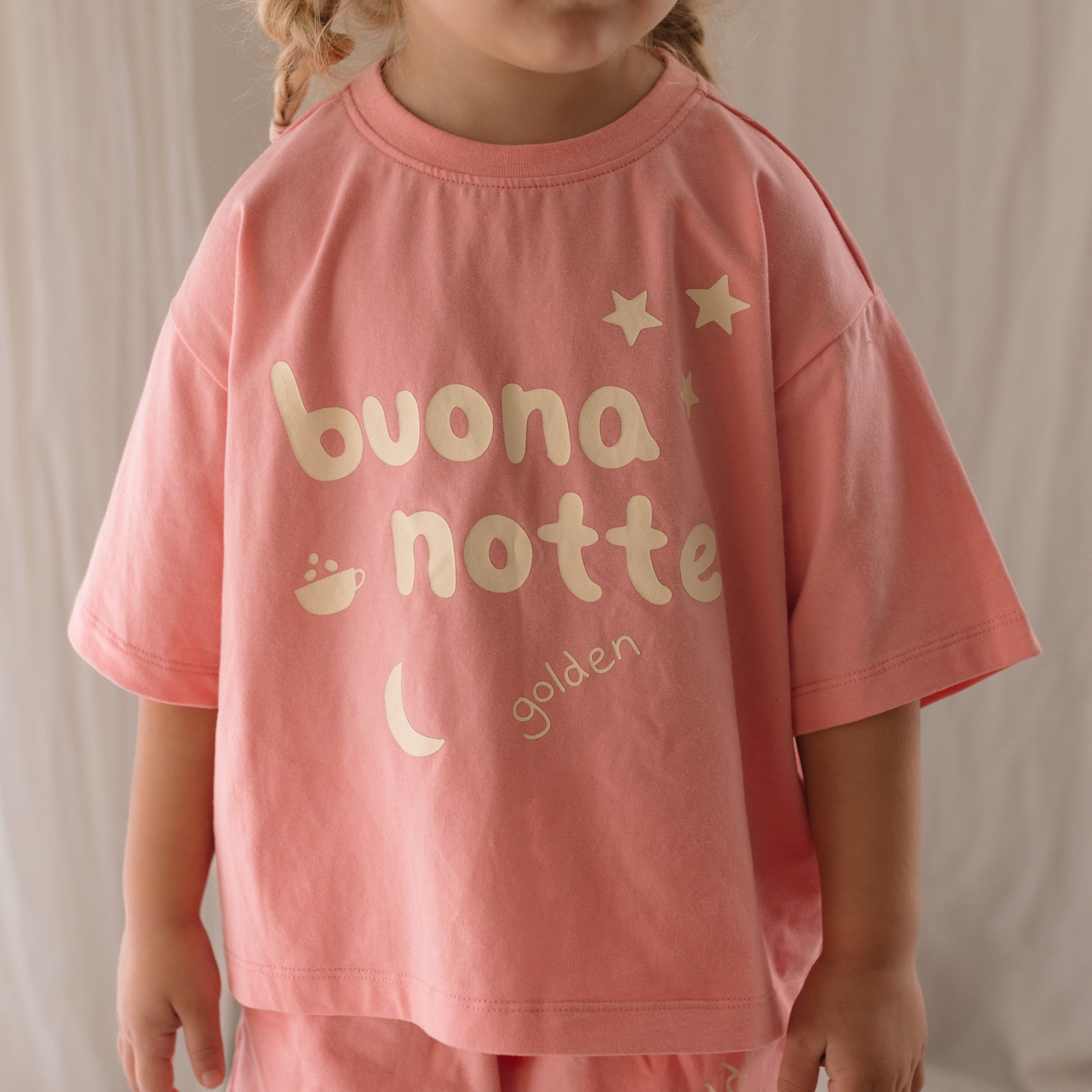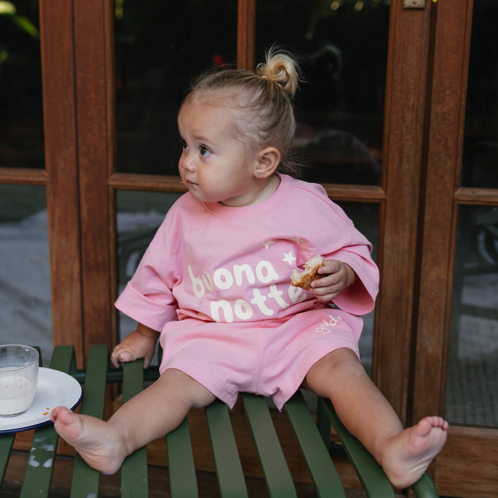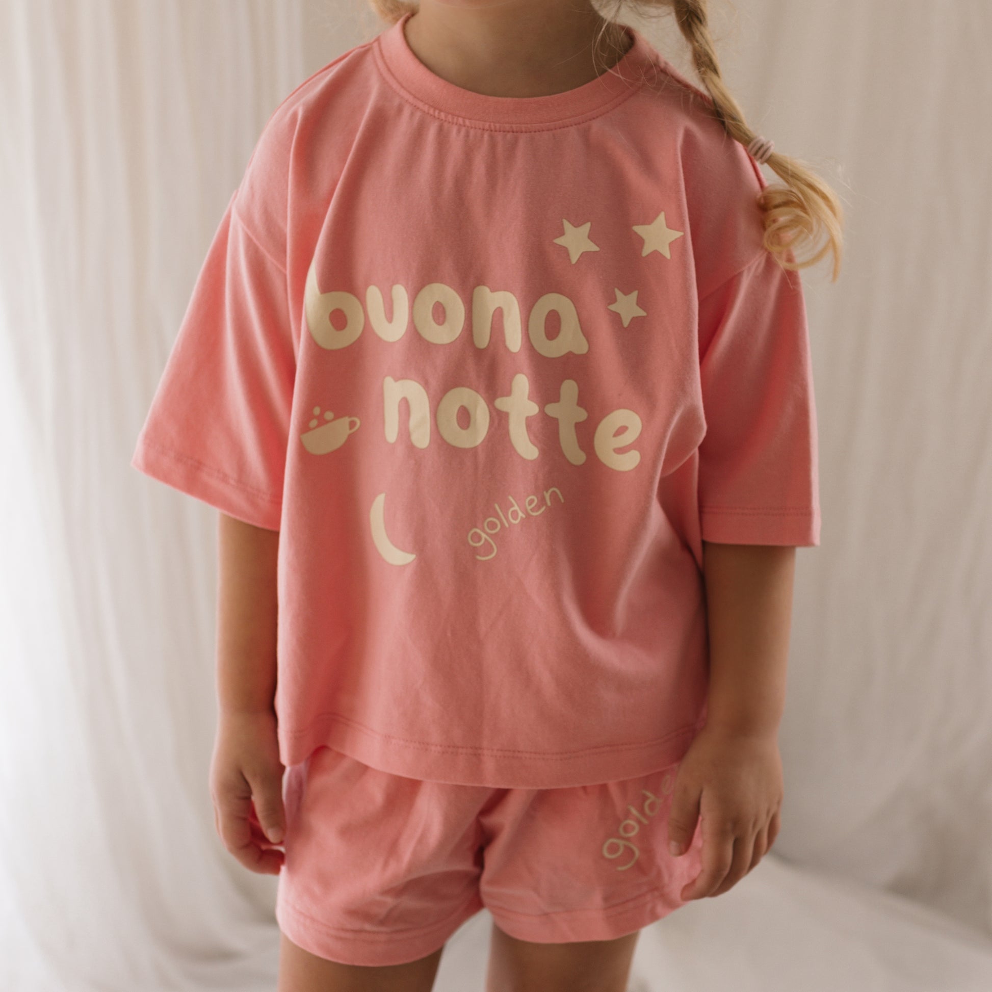 The Buona Notte Summer Pyjamas are made from 95% cotton jersey, 5% spandex with an incredibly soft hand feel. The print is inspired by our love of all things sleep related, from warm milk and snuggles at night to bagels, fresh orange juice and (often cold) coffee in the morning.