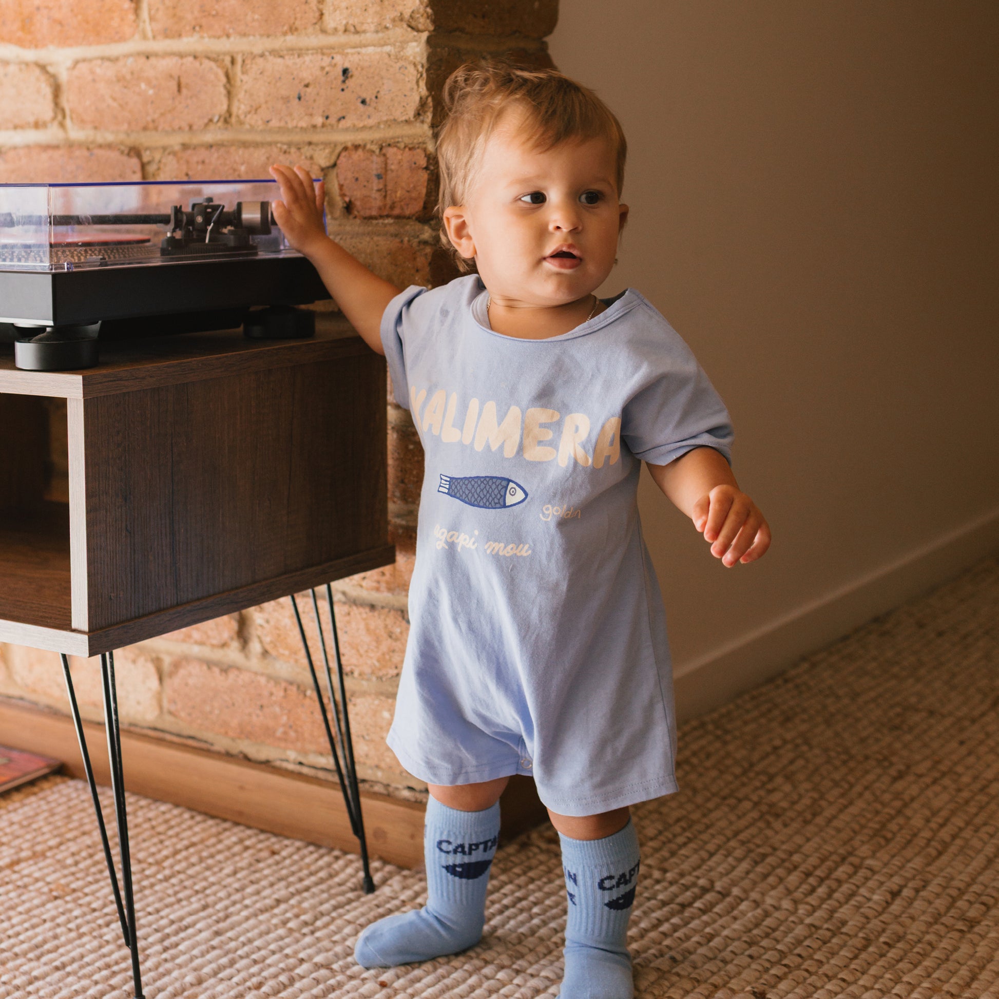 The Captain socks are the perfect finishing touch for your little one's outfit. Our ribbed socks are designed with reinforced toe caps featuring the word Captain and a cute blue fish to the top of each sock. The footbed features the Golden logo. The design is inspired by the feeling we get when we are sailing on the deep blue seas, Aloha Captain!