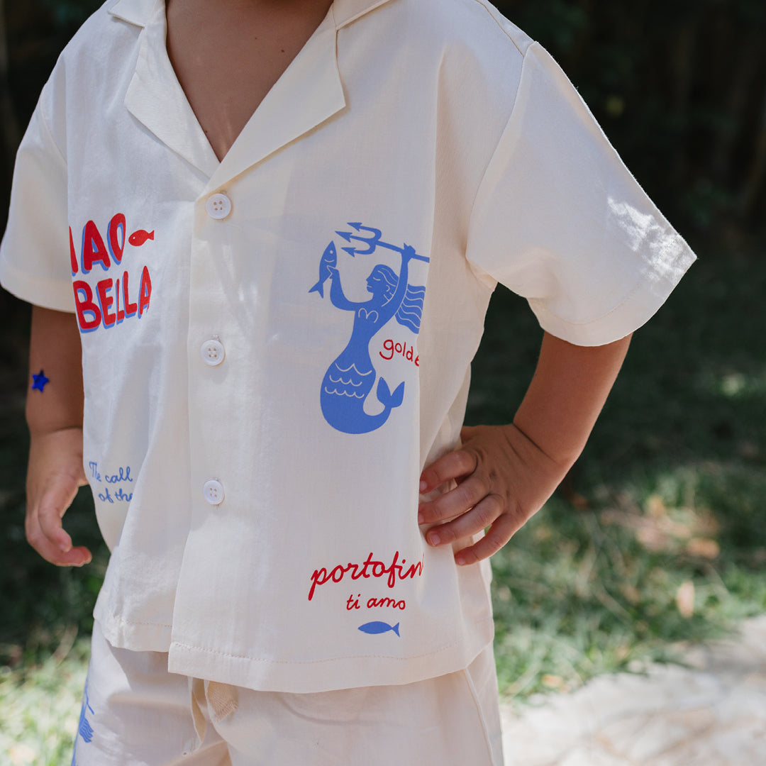 The shirt features our hand drawn 'Ciao Bella' print, a siren (sirena in Italian) from the rocky shores of Capri, 'the call of the sea' and Portofino illustration.