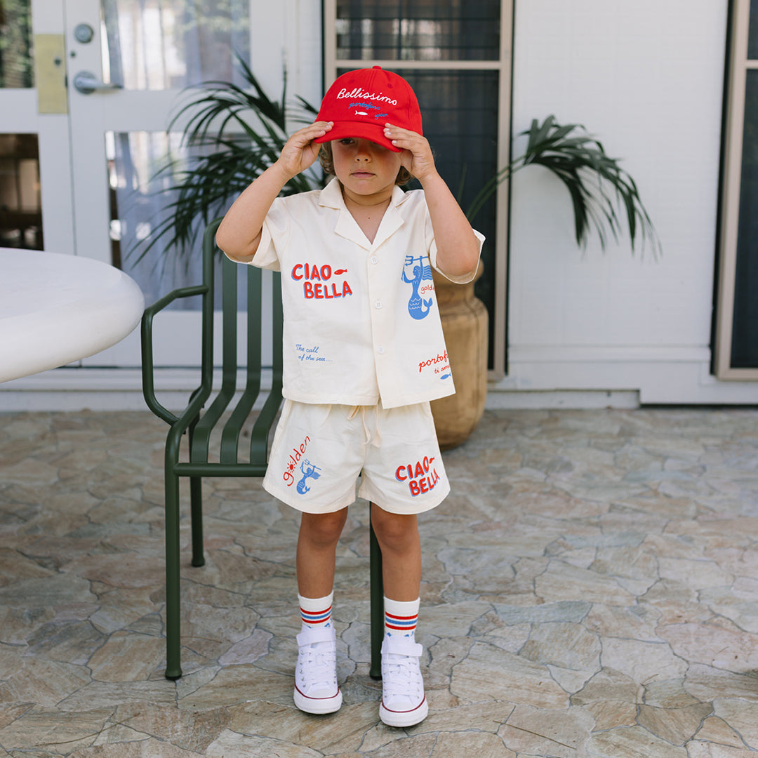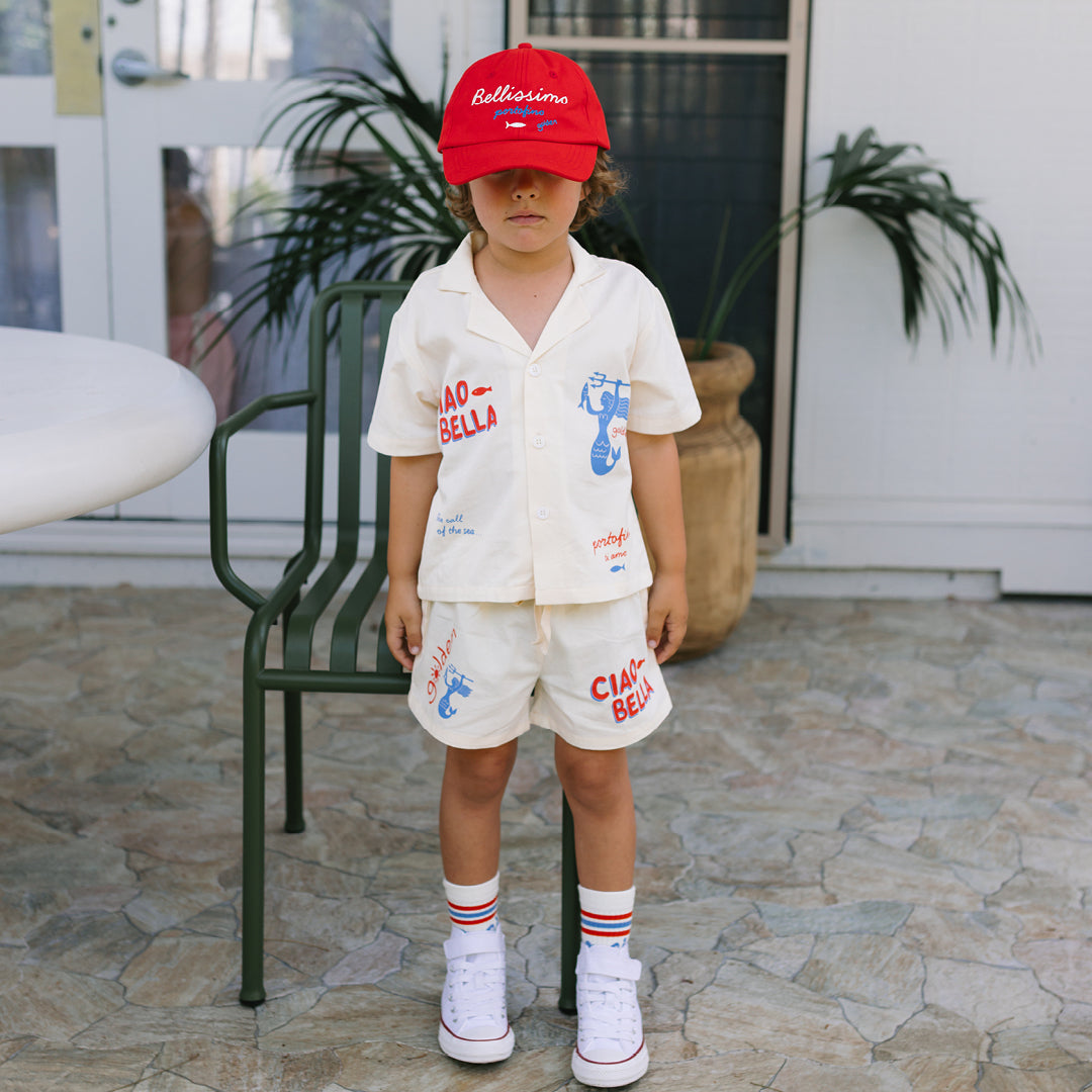 The Ciao Bella Sirena Lounge Set is made from 100% cotton with a soft hand feel. The print is inspired by our love of summer evenings with our little ones. A special dinner or outing where their look is more elevated, more refined. This outfit is perfect for dinners on vacation, special events and occasions where you need something more polished than a regular tee.