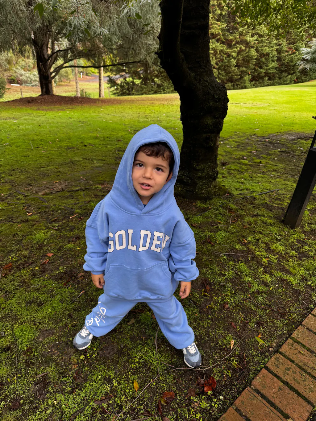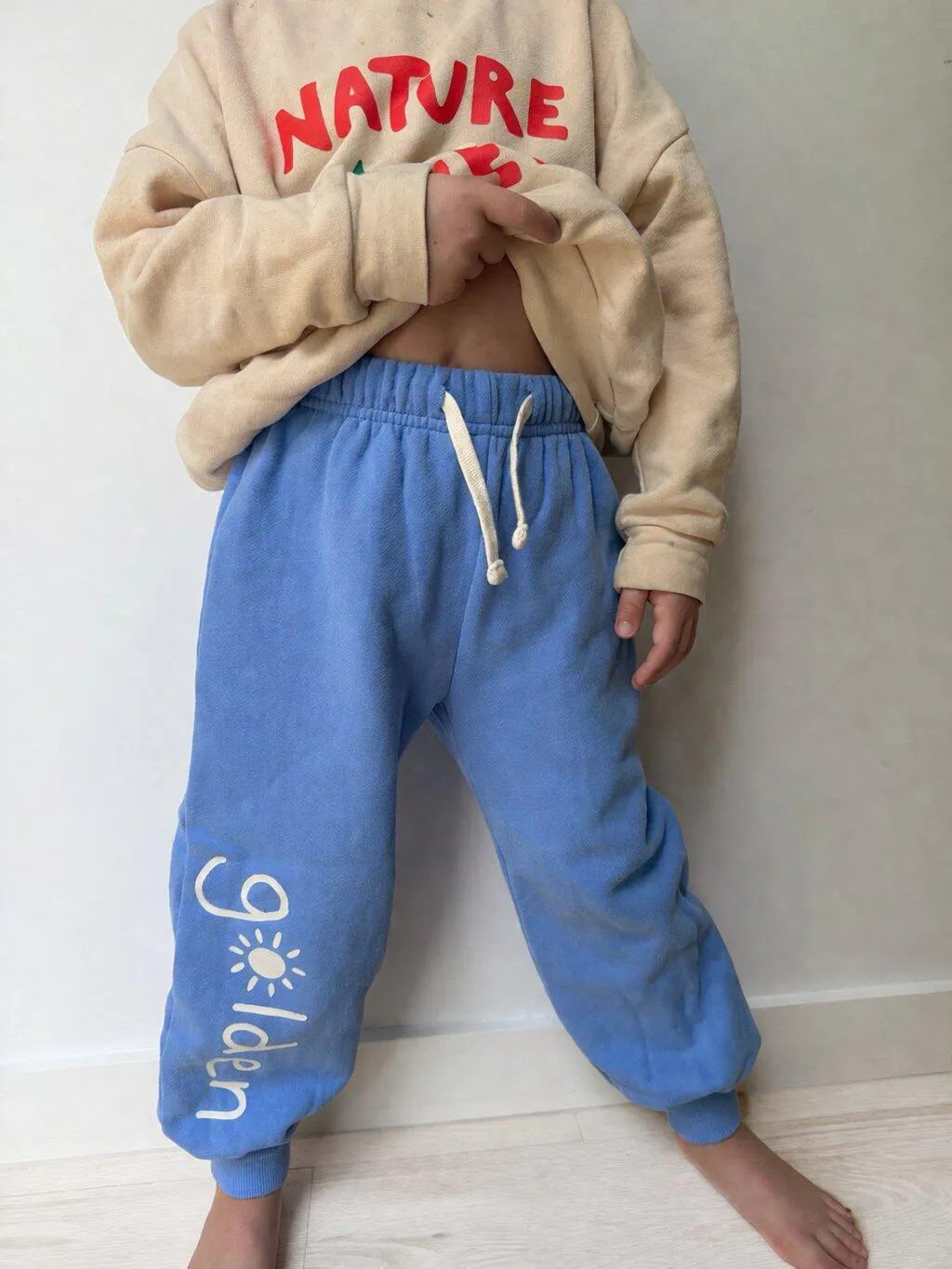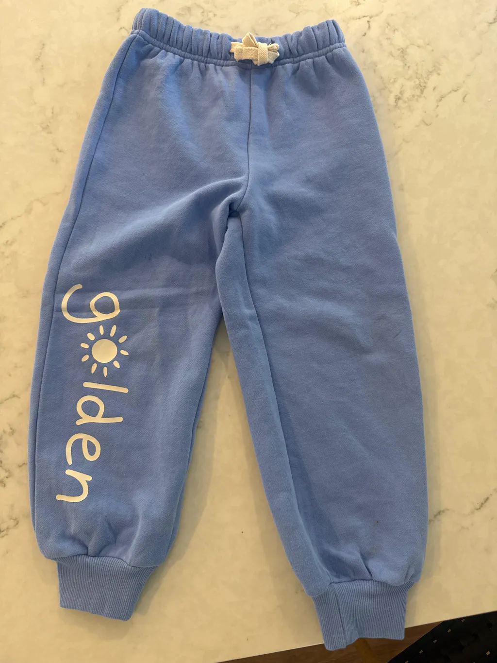 These wide leg pants are designed for an oversized fit, with an elasticated waist and two concealed side pockets. They feature a contrast golden cream (yellow)terry towel stripe to the sides. They are a versatile fit and can be worn slightly cropped as their legs grow. They are super comfortable and adorable on!