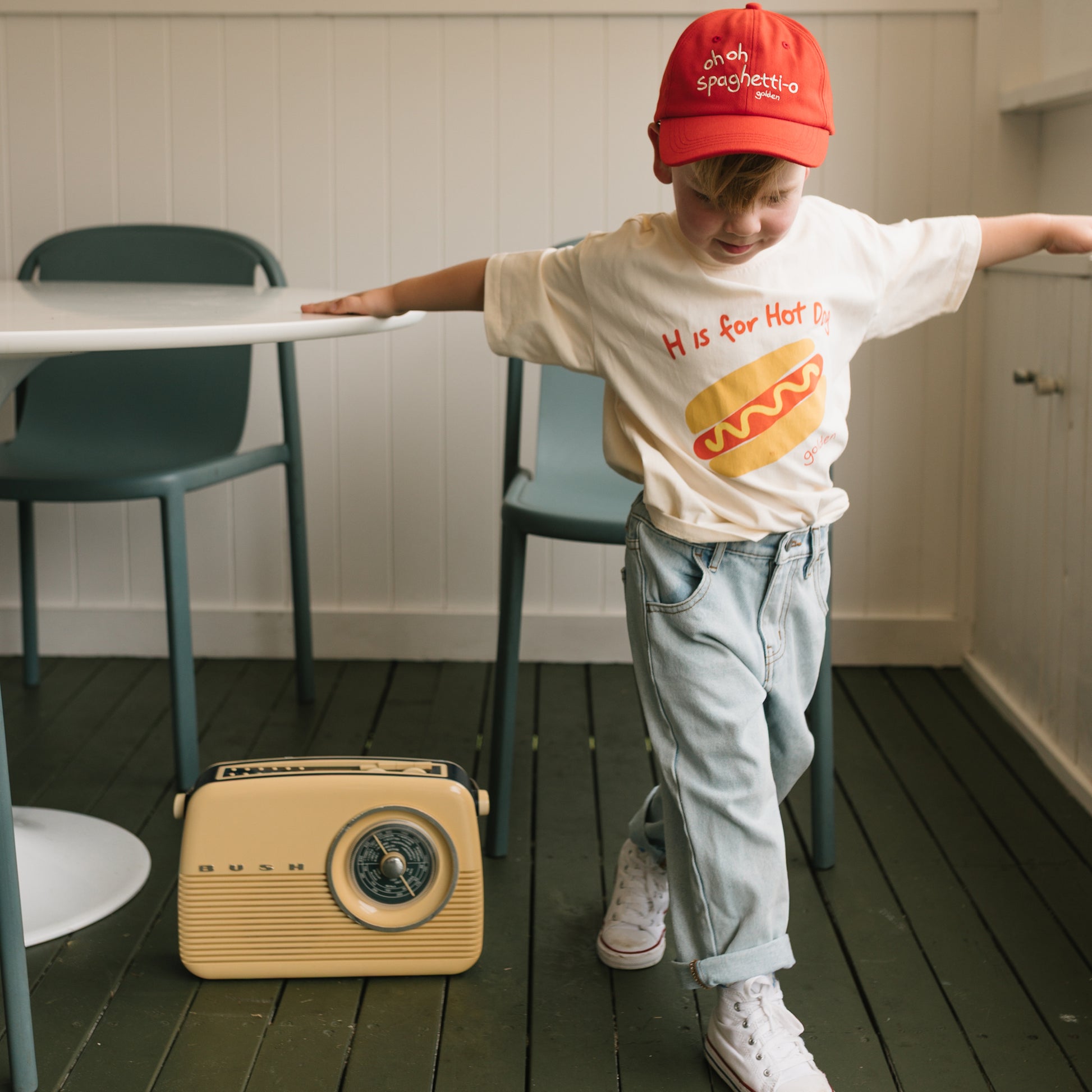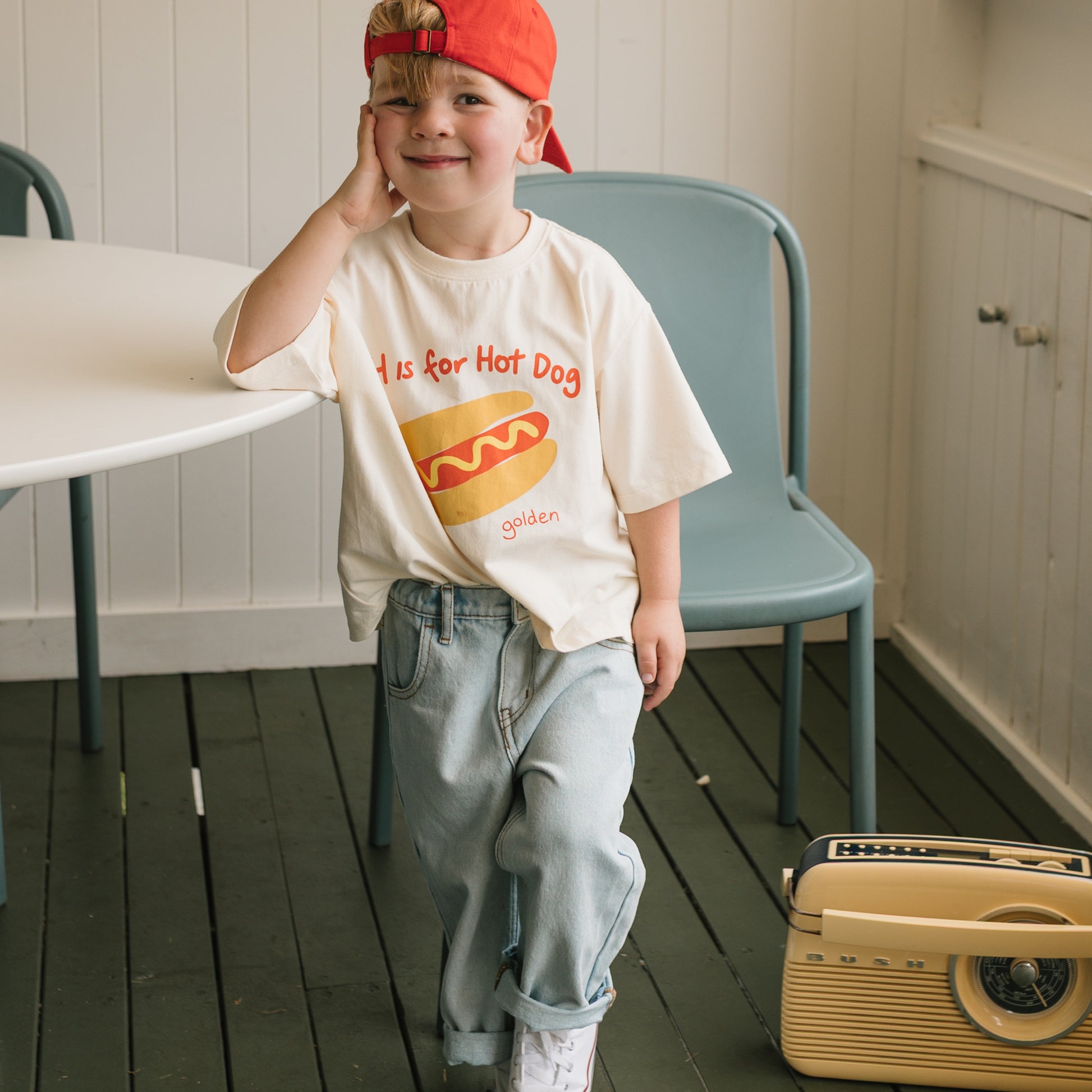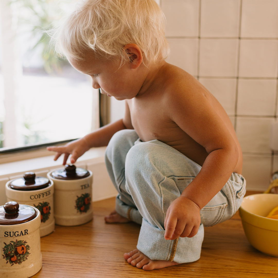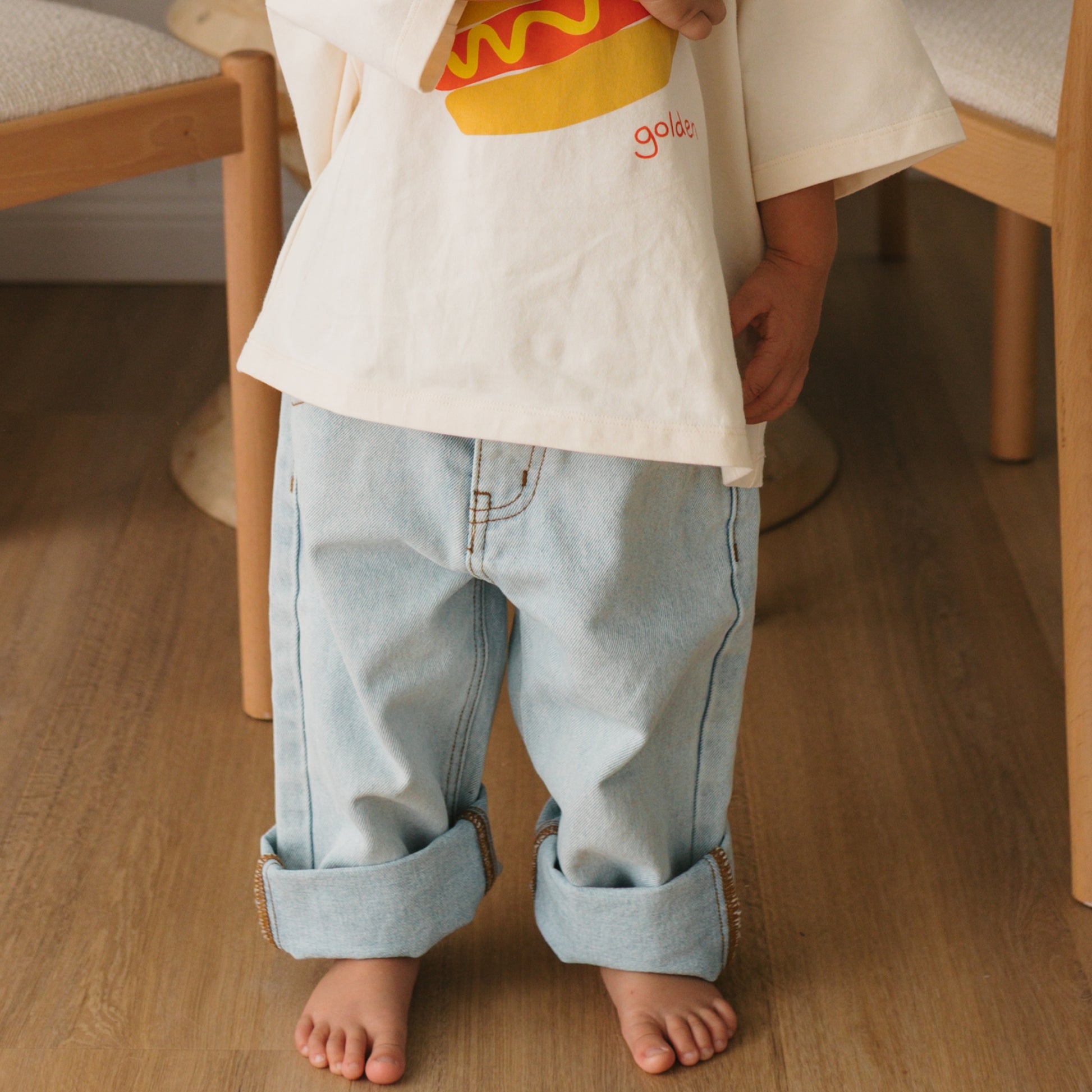 These loose fit jeans are designed for an oversized fit, with a zipper / button closure and elasticated waist for comfort and easy dressing. These jeans are adjustable, with elastic / buttons on the inside of the waist to allow the waist of the jeans to be made smaller if necessary. There are two side pockets and two back pockets plus belt loops. They feature the 'golden' logo and sun embroidered in cream to the back pocket. They are a versatile fit and can be worn with the legs cuffed until they grow into them. They are super comfortable and adorable on!