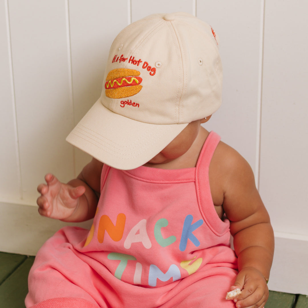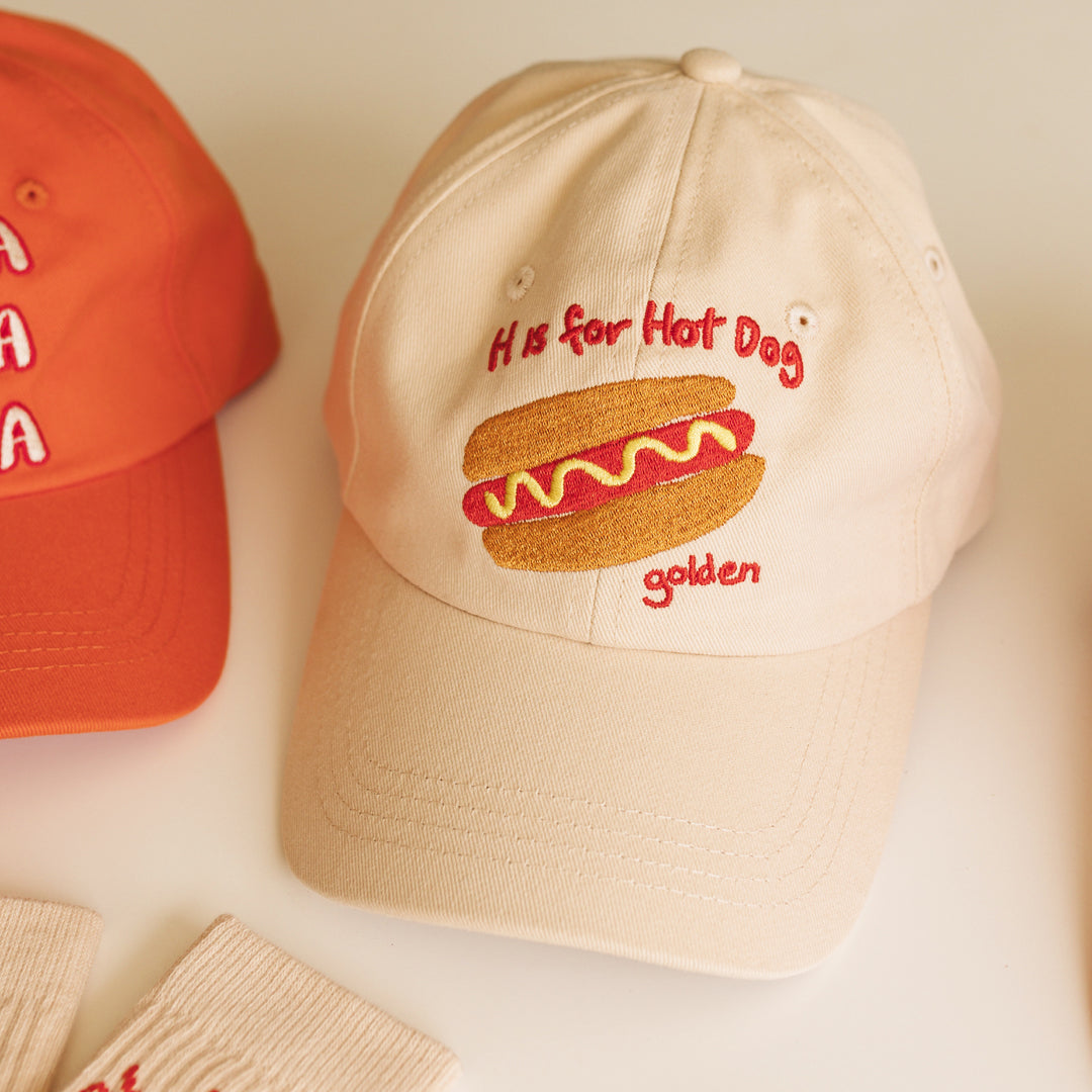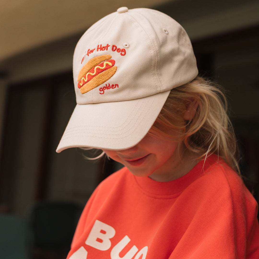 The cap features the words ‘H is for Hot Dog’ and a hot dog embroidered to the front with the Golden logo embroidered to the back. It is adjustable with a brass clasp to the back.