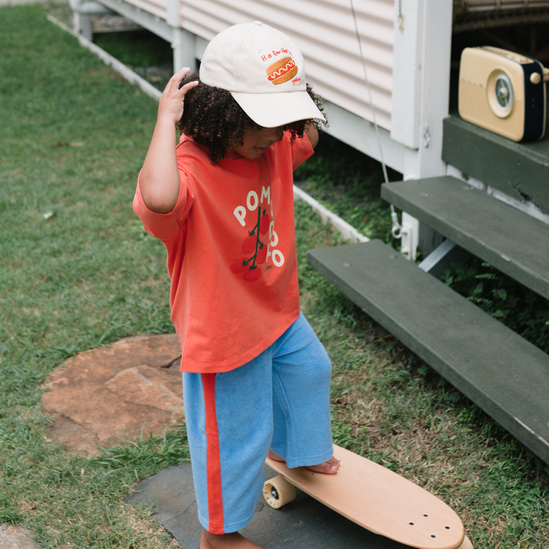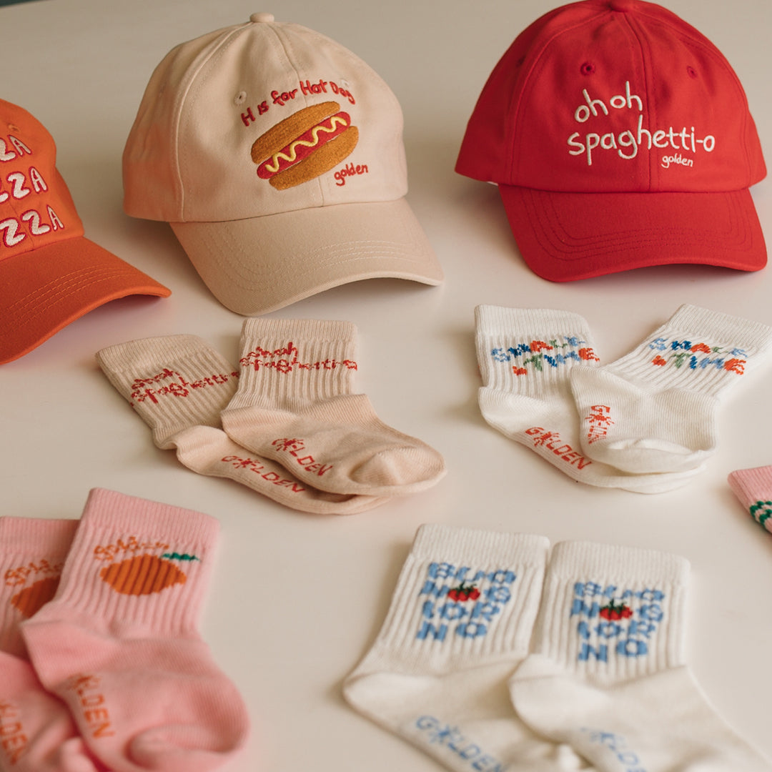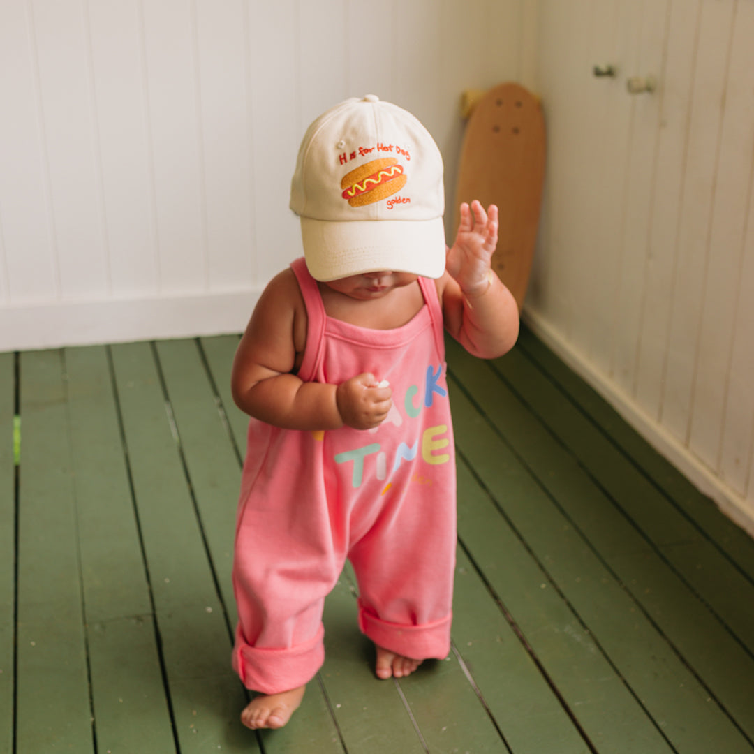 The cap features the words ‘H is for Hot Dog’ and a hot dog embroidered to the front with the Golden logo embroidered to the back. It is adjustable with a brass clasp to the back.