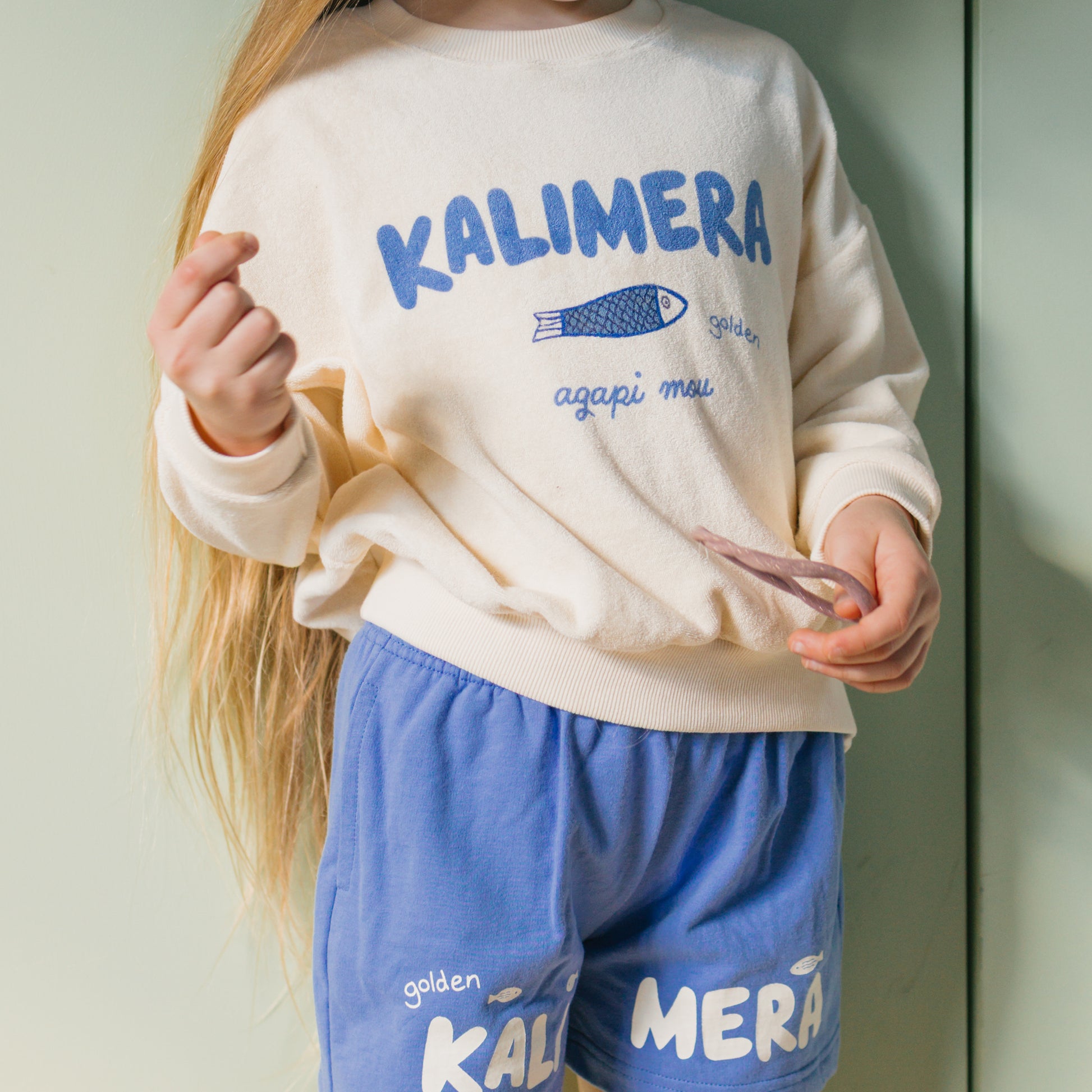 The Kalimera Sweater is made from 100% cotton terry towel with an incredibly soft hand feel. The print is inspired by the feeling of the word 'Kalimera' bringing warm memories of family and travels from Hydra to Corfu!