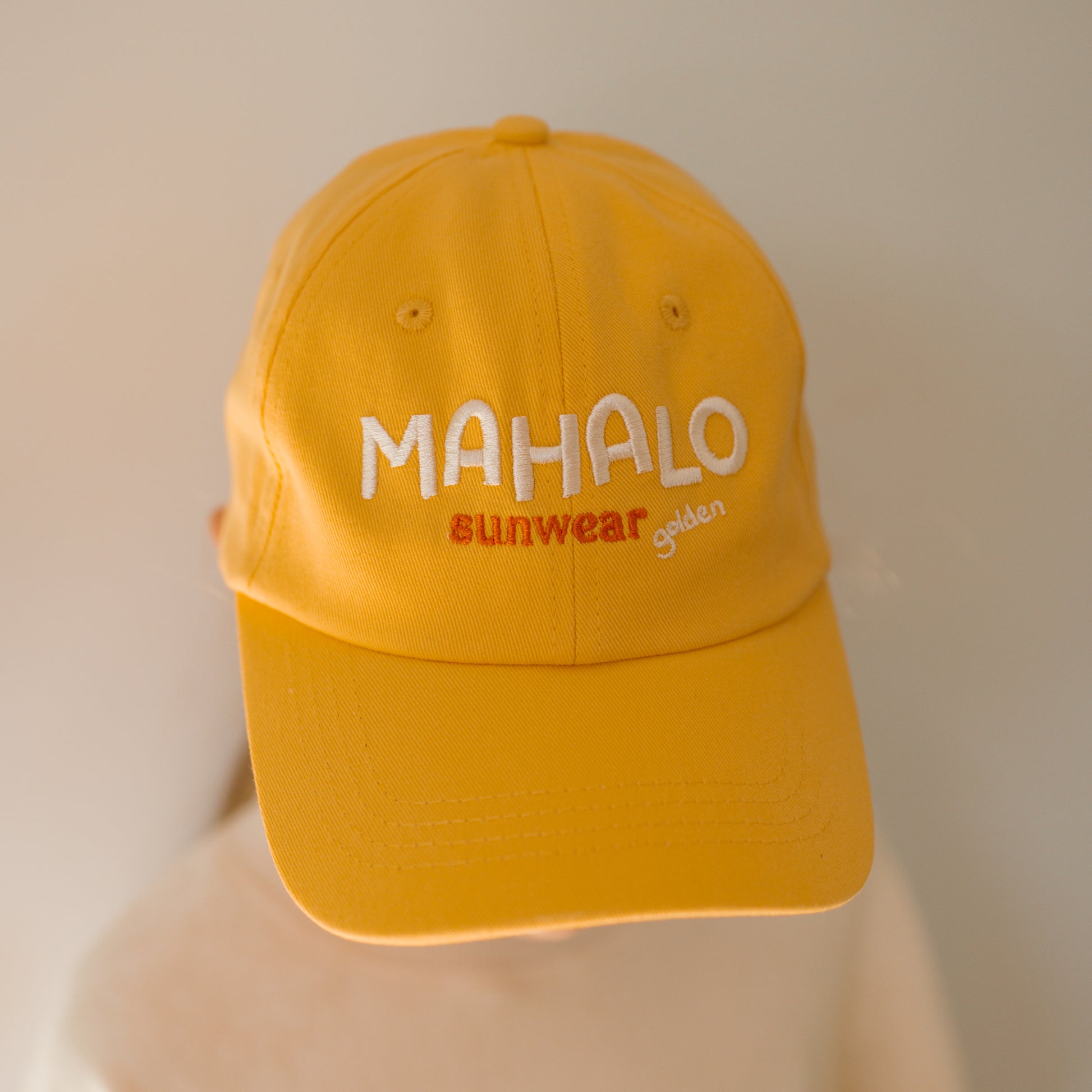 The cap features the word ‘Mahalo’ (to show gratitude in Hawaiian) embroidered to the front with the Golden logo embroidered to the back. It is adjustable with a brass clasp to the back.