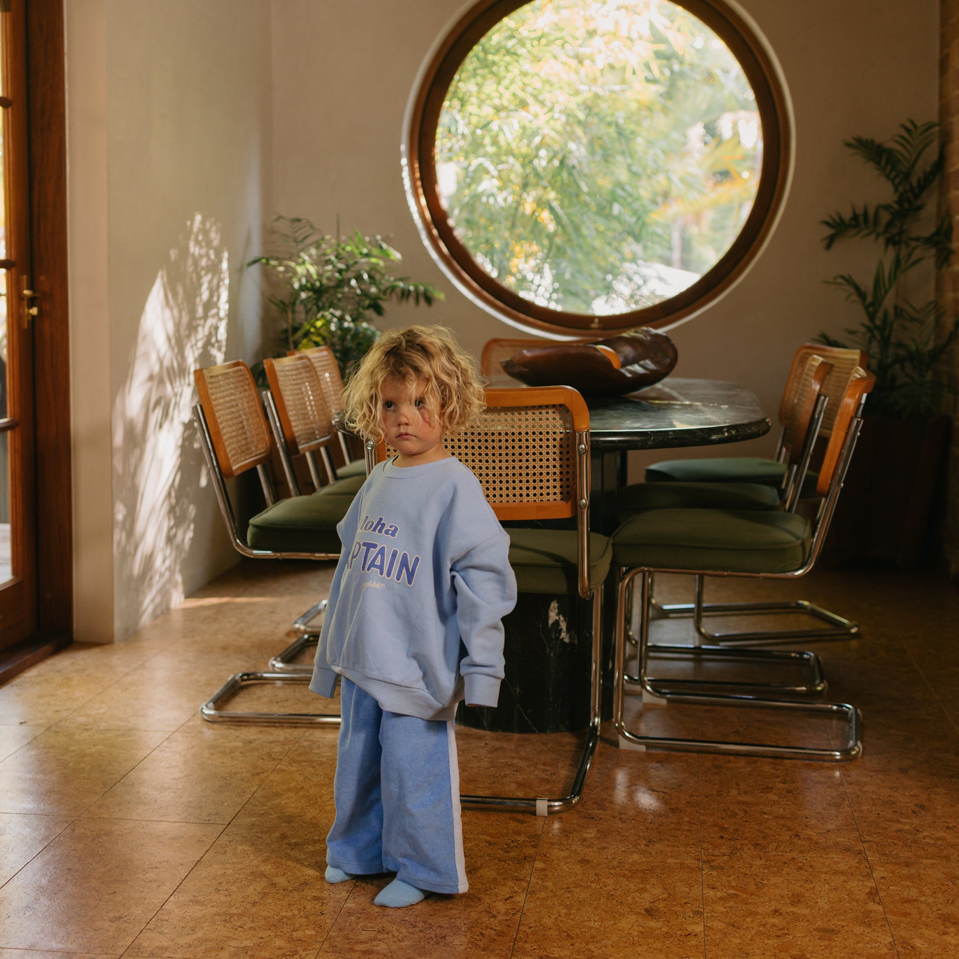 These wide leg pants are designed for an oversized fit, with an elasticated waist and two concealed side pockets. They feature a contrast light blue terry towel stripe to the sides. They are a versatile fit and can be worn slightly cropped as their legs grow. They are super comfortable and adorable on!